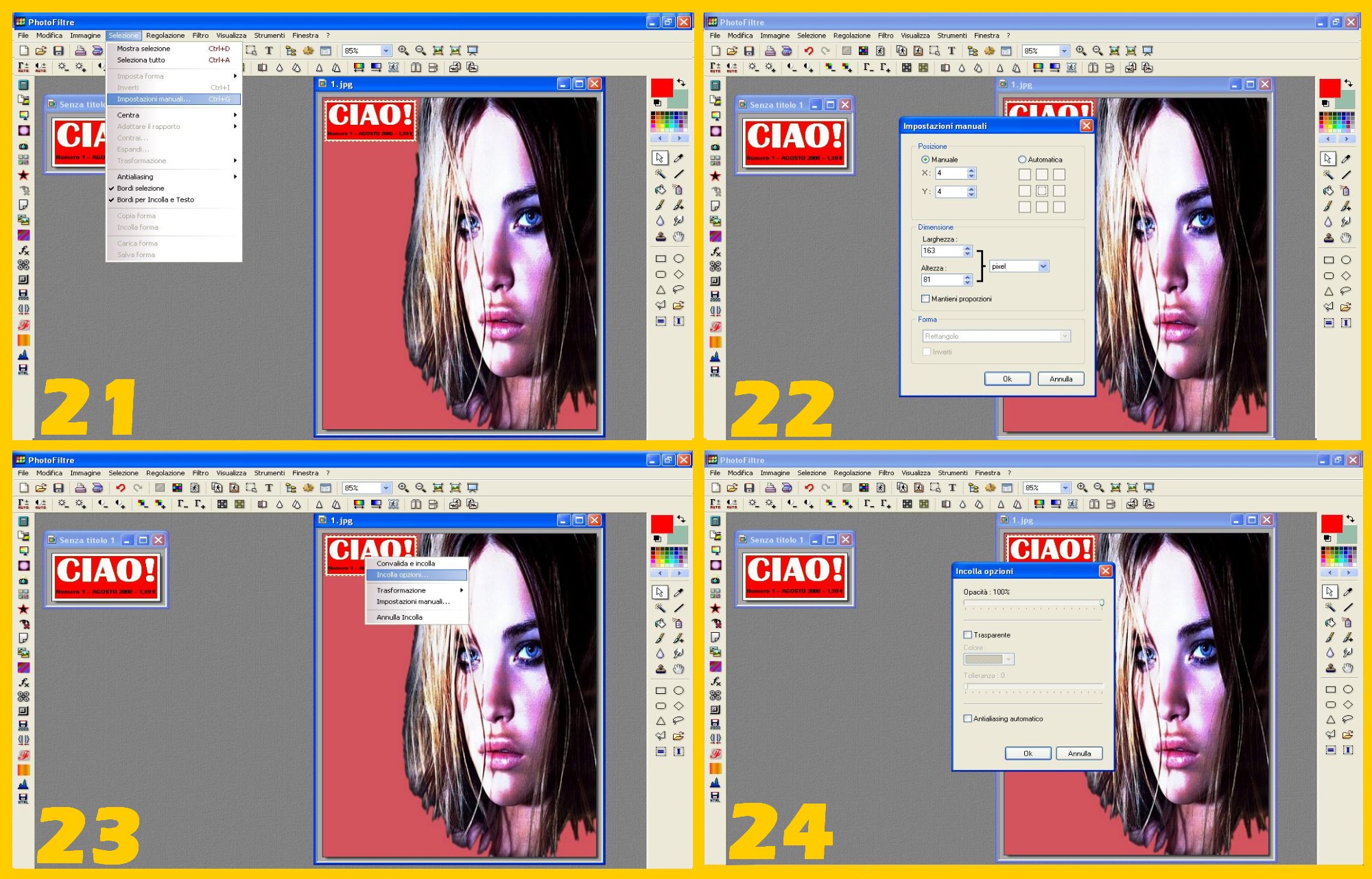 - Quando è sistemata, per essere sicuri che s’incolli bene, col mouse dentro la selezione cliccate sul tasto destro e successivamente su Incolla Opzioni (imm.23) e nella finestra successiva deselezionate Antialiasing e cliccate su Ok (imm.24).