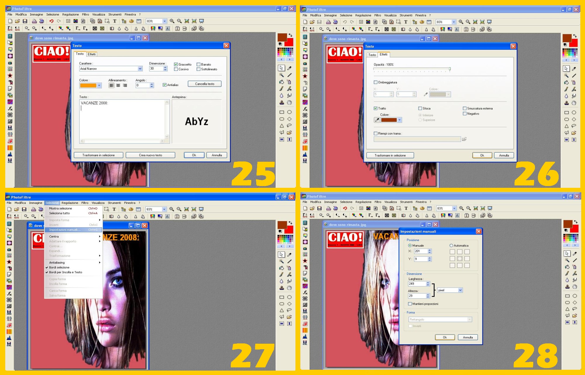 Continuamo con la nostra rivista andando a destra. Faremo ora la scritta sulla foto in alto a destra. Clicchiamo dunque sulla T nel menù in alto per scrivere: carattere Arial Narrow, dimensione 30, selezionate Grassetto (BOLD), Colore arancio. Scrivete il testo in alto (VACANZE 2008: ) (imm.25) e senza confermare cliccate in alto su Effetti (EFFETS) e nella pagina successiva selezionate Tratto (STROKE) e mettete marrone nel Colore per confermare poi con Ok (imm.26).