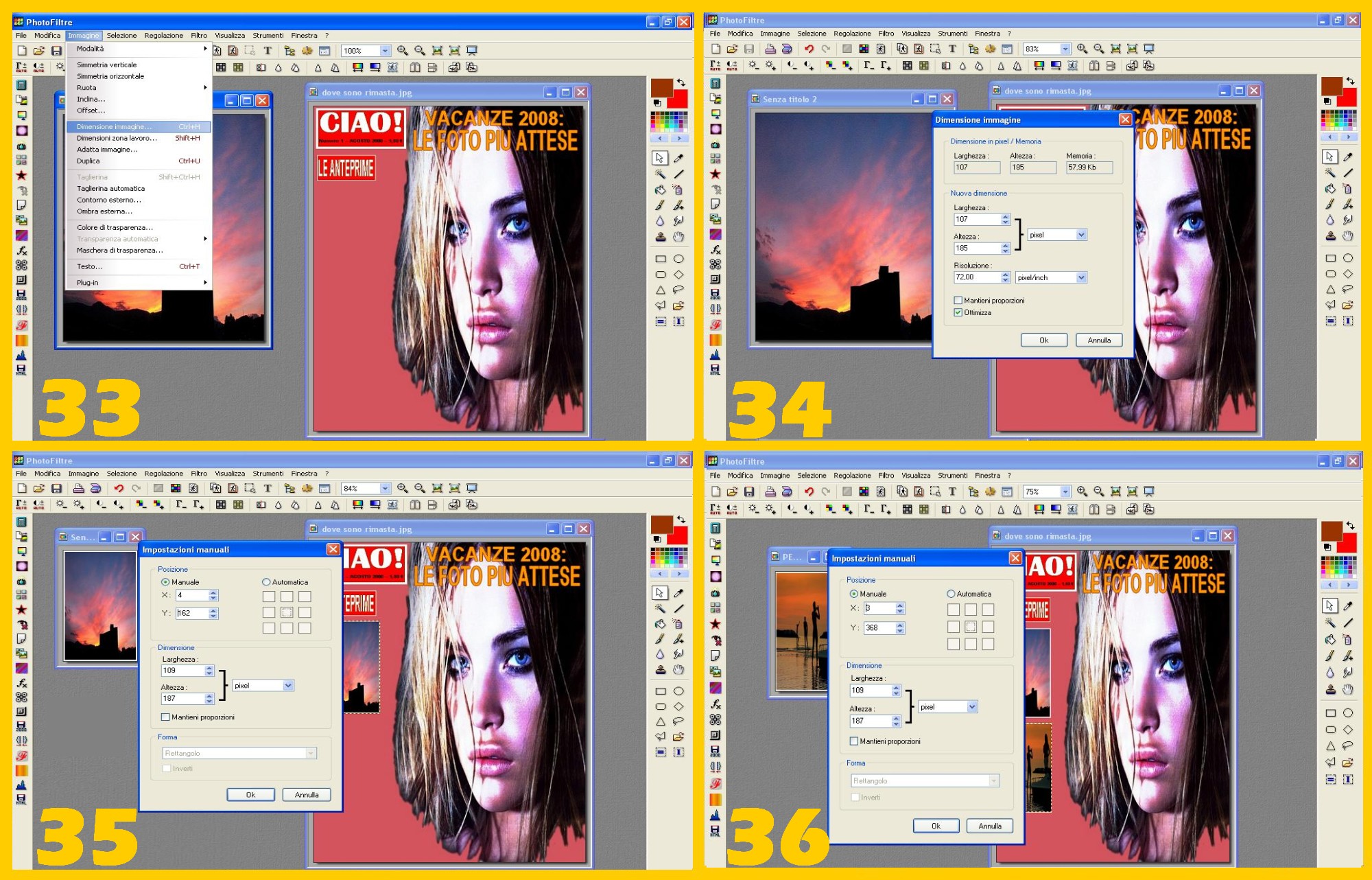 e procederete a ridurla cliccando su Immagine – Dimensione Immagine (IMAGE – IMAGE SIZE) (imm.33), dopo aver deselezionato Mantieni Proporzioni (PRESERVE ASPECT RATIO), a 107 di larghezza e 185 di altezza (imm.34). -