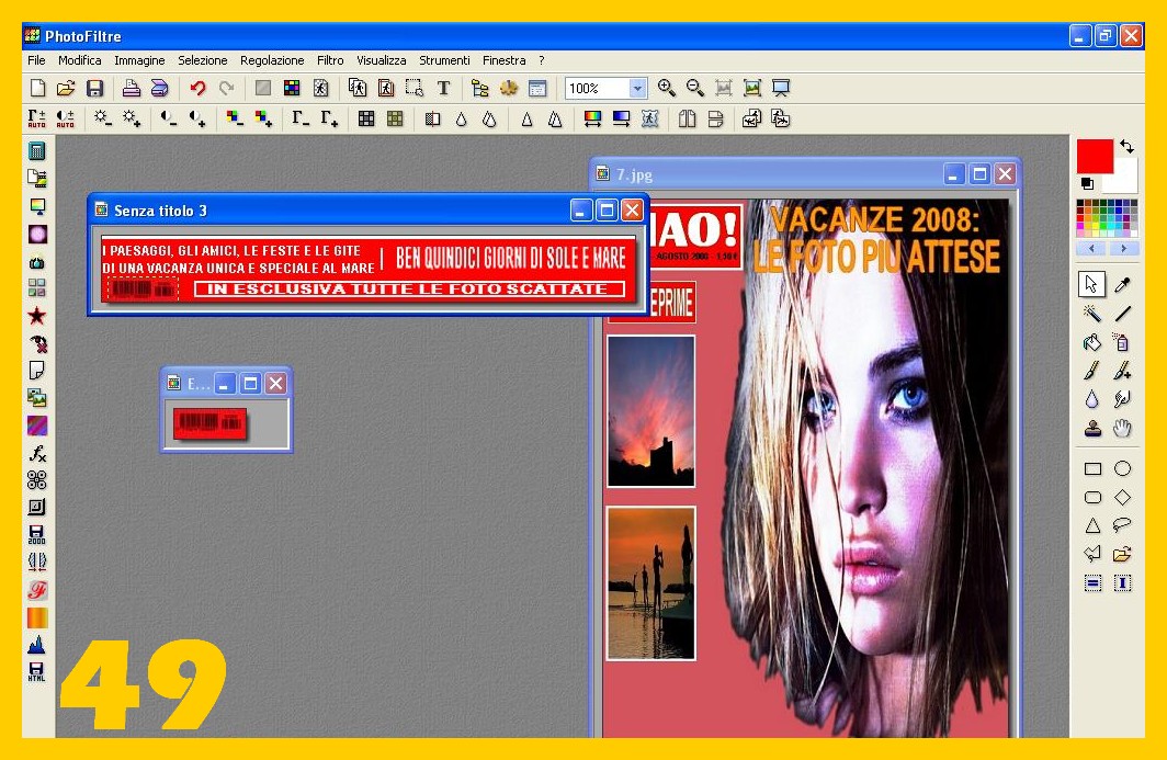 facendo però brevi cenni alle altre. Ovviamente vi spiego come io ho fatto, ma voi potete fare in tanti altri modi… Può sembrare molto complicato a leggere, ma non lo è credetemi, è veramente facile dato che ogni cosa la potrete fare a seconda di come volete anche semplicemente spostandola voi…Le piccole foto le potete mettere con cornice o senza, dentro quadri più grandi e colorati con sotto una piccola spiegazione o con un titolo dentro o fuori del riquadro. La foto principale potete metterla, come nella copertina che spiego, come sfondo o solo occupando una parte della rivista perché non sparisca sotto gli striscioni con i titoli… potete fare tutto usando le impostazioni manuali o semplicemente ingrandendo le vostra scritte e le vostre immagini tanto da poter spostare semplicemente spingendo la selezione di ogni scritta o foto manualmente, potete fare le scritte semplici o con effetti (come nella rivista che vedete al terzo posto nelle immagini sopra dove ho usato un contorno progressivo), ecc.… Sta a voi ed alla vostra fantasia fare una bellissima copertina in un modo anche molto semplice e senza complicarsi la vita con misure… 🙂 …io ho dovuto spiegarlo perché forse qualcuno non avrebbe saputo bene come fare…