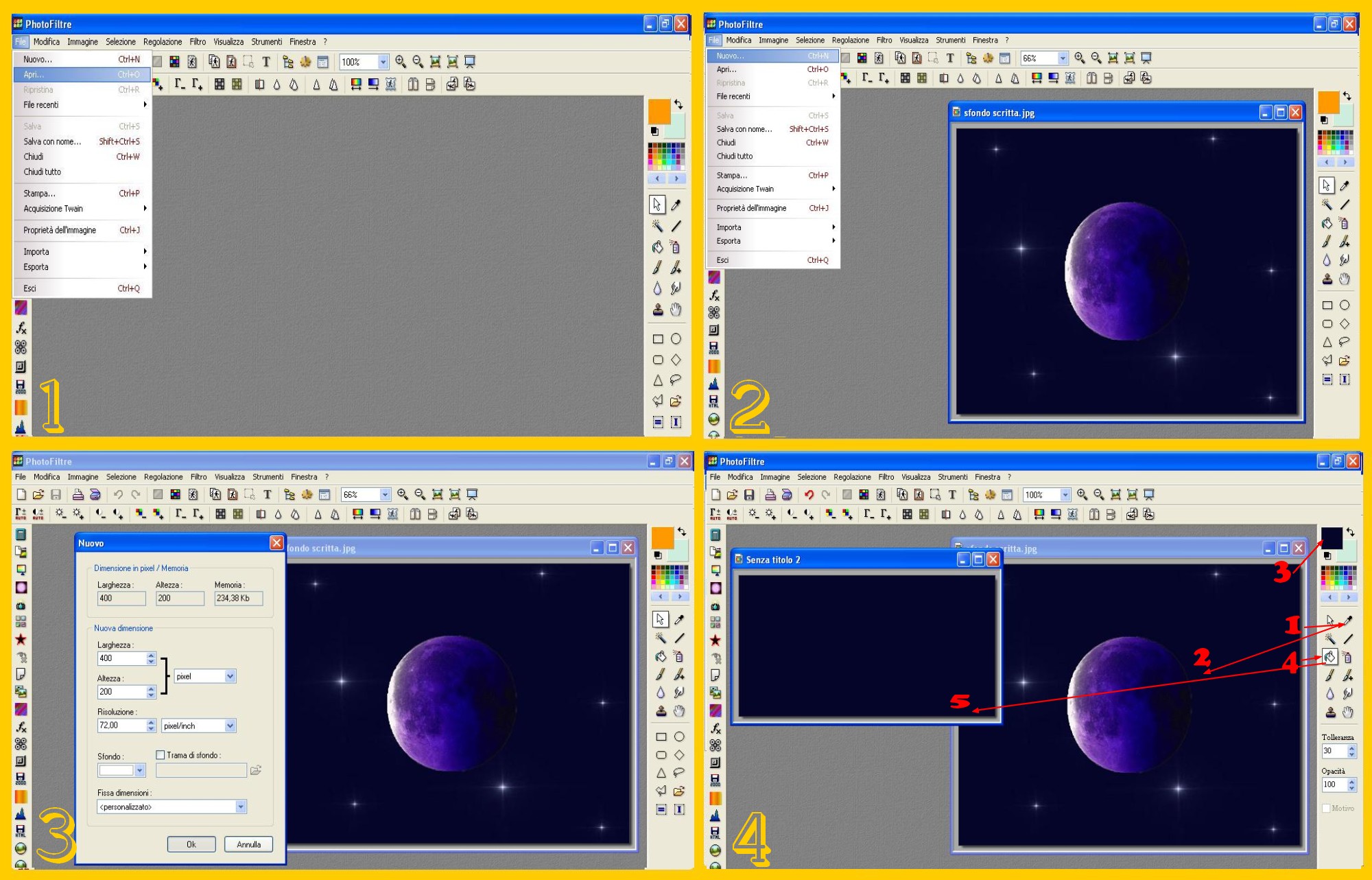 Aprite un documento nuovo, in Photofiltre: File – Nuovo (FILE – NEW) (imm.2) di 400 pixels di larghezza e 200 di altezza approssimativamente (imm.3) logicamente dipenderà tutto dalla misura della vostra immagine su cui vorrete fare la scritta. Le misure che io metto qua vanno bene per una immagine come la mia che è di 800 x 600. Se avete una immagine più piccola tutto verrà in proporzione diminuito, anche la dimensione del carattere che userete in seguito.