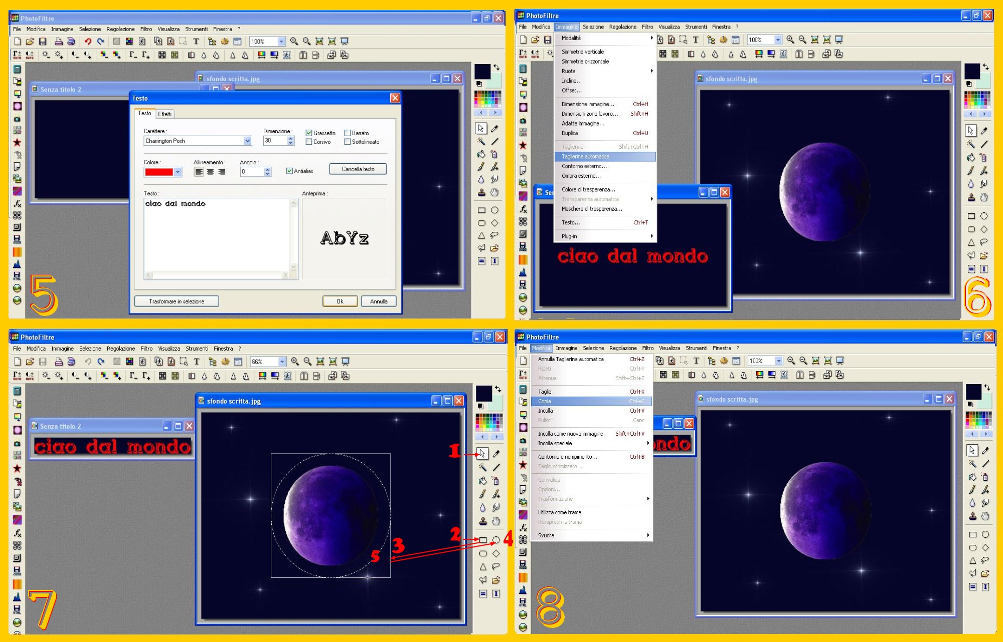 Cliccate sulla Punta di Freccia del Menù a Destra (punto 1 imm.7) per far apparire, se non ci fossero, le selezioni e successivamente sotto sul Rettangolo di Selezione (punto 2 imm.7) e tornate all’immagine e tracciate una selezione quadrata nel punto che volete sia attorniato dalla vostra scritta (punto 3 imm.7), per tornare una volta che il vostro quadrato sia sistemato bene al Menù di Destra e cliccare sull’Ellisse di Selezione (punto 4 imm.7). La vostra selezione quadrata ora sarà diventata una circonferenza o una ellisse (punto 5 imm.7).