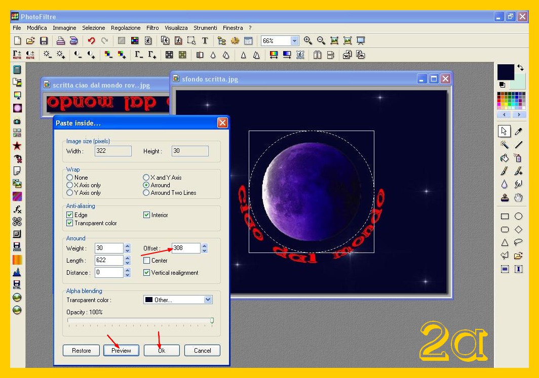 Come nel punto 10 sopra, cambiamo la lunghezza cercando di farla solo girare nella metà inferiore ora… Io in questo caso ho lasciato la stessa lunghezza di prima (622) dato che vorrei come prima che occupasse pressa poco metà del pianeta e non andasse oltre. Logicamente per farla cambiare di posizione e che giri sotto e sia di una lunghezza simile almeno in entrambi i lati devo cambiare il valore di Offset aumentandolo man mano e controllando con l’anteprima gli spostamenti verso una parte o l’altra. E da -4 che avevamo prima come valore ora sono arrivata a 308 (imm.2a ). La scritta ora sembra nella posizione giusta così confermo con Ok.