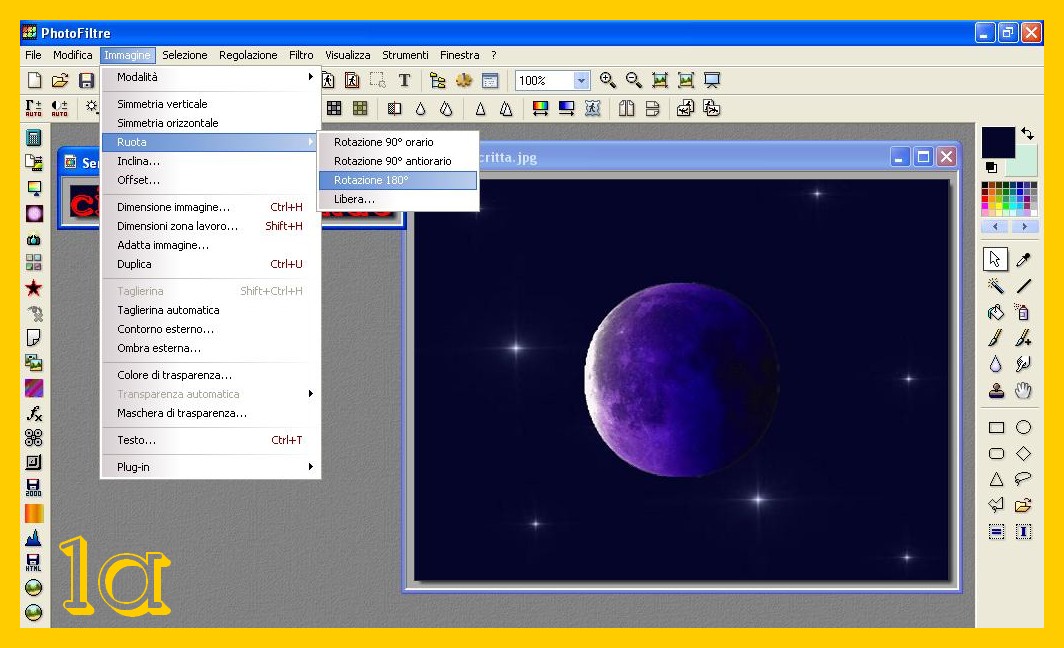 Toccate per attivare la vostra scritta e cliccate nel Menù in Alto su Immagine – Ruota – Rotazione 180° (IMAGE – ROTATE – ROTATE 180°) (imm.1a ).
