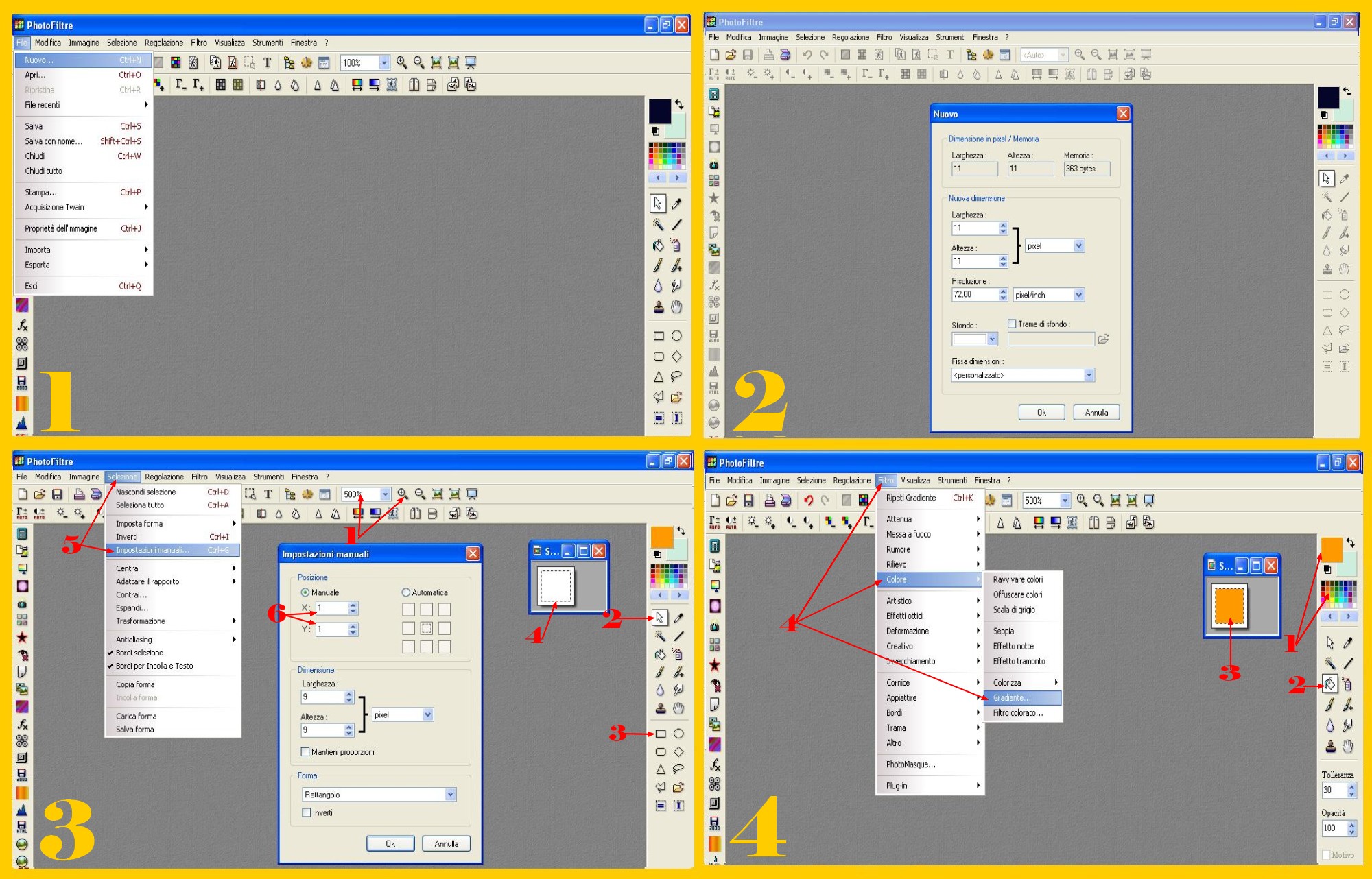 Ora colorerete nel colore che preferite il vostro quadrettino dentro la selezione andando al Menù di Destra scegliendo il colore nel Menù in Alto (punto 1 imm.4), cliccando poi sul Barattolino di Colore (punto 2) e cliccando infine dentro la nostra Selezione (punto 3 imm.4). Io questa volta ho scelto l’arancione. Sempre con la selezione attiva, potete ora modificare il vostro colore, se lo preferite, cliccando per esempio su Filtro- Colore – Gradiente (FILTER – COLOR- GRADIENT) (punto 4 imm.4).