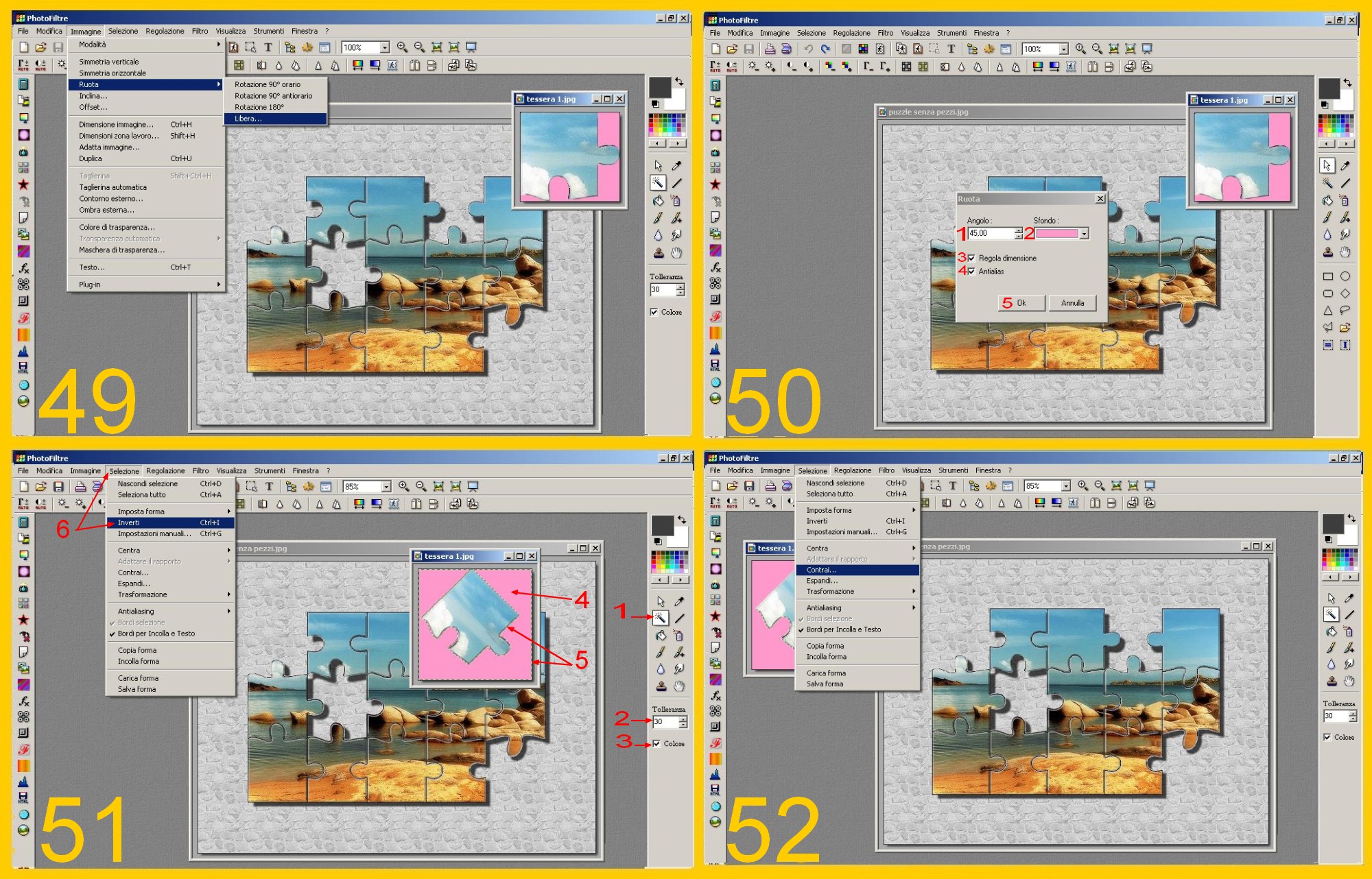 Cliccate ora sulla Bacchetta Magica, tolleranza 30 e casella colore selezionata e tornando alla tessera cliccate con la Bacchetta sul colore rosa. Vi rimane selezionata tutta la parte al di fuori della tessera ed il bordo esterno. Cliccate su Selezione – Inverti (SELECTION – INVERT) (imm.51).