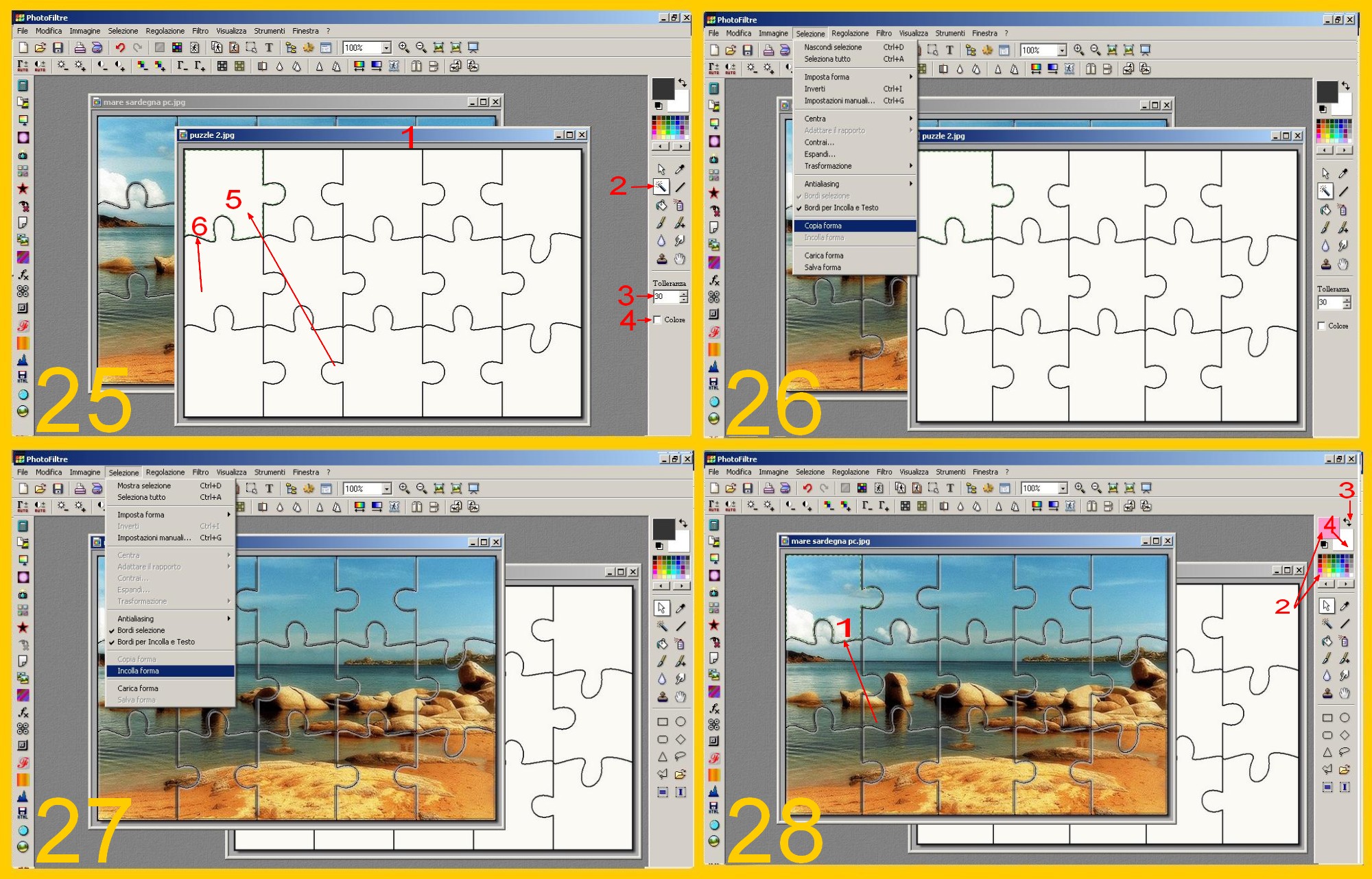 Toccate il documento bianco, quello diviso in tessere, per attivarlo (punto 1 imm.25). Andate nel Menù a Destra e cliccate sulla Bacchetta Magica (punto 2 imm.25), Tolleranza 30 (punto 3 imm.25) e, deselezionata la casellina colore in fondo (punto 4 imm.25) cliccate con la Bacchetta dentro la parte bianca della tessera che vogliamo togliere (punto 5 imm.25), quella in alto a sinistra. La parte bianca della vostra tessera rimane selezionata. (punto 6 imm.25).