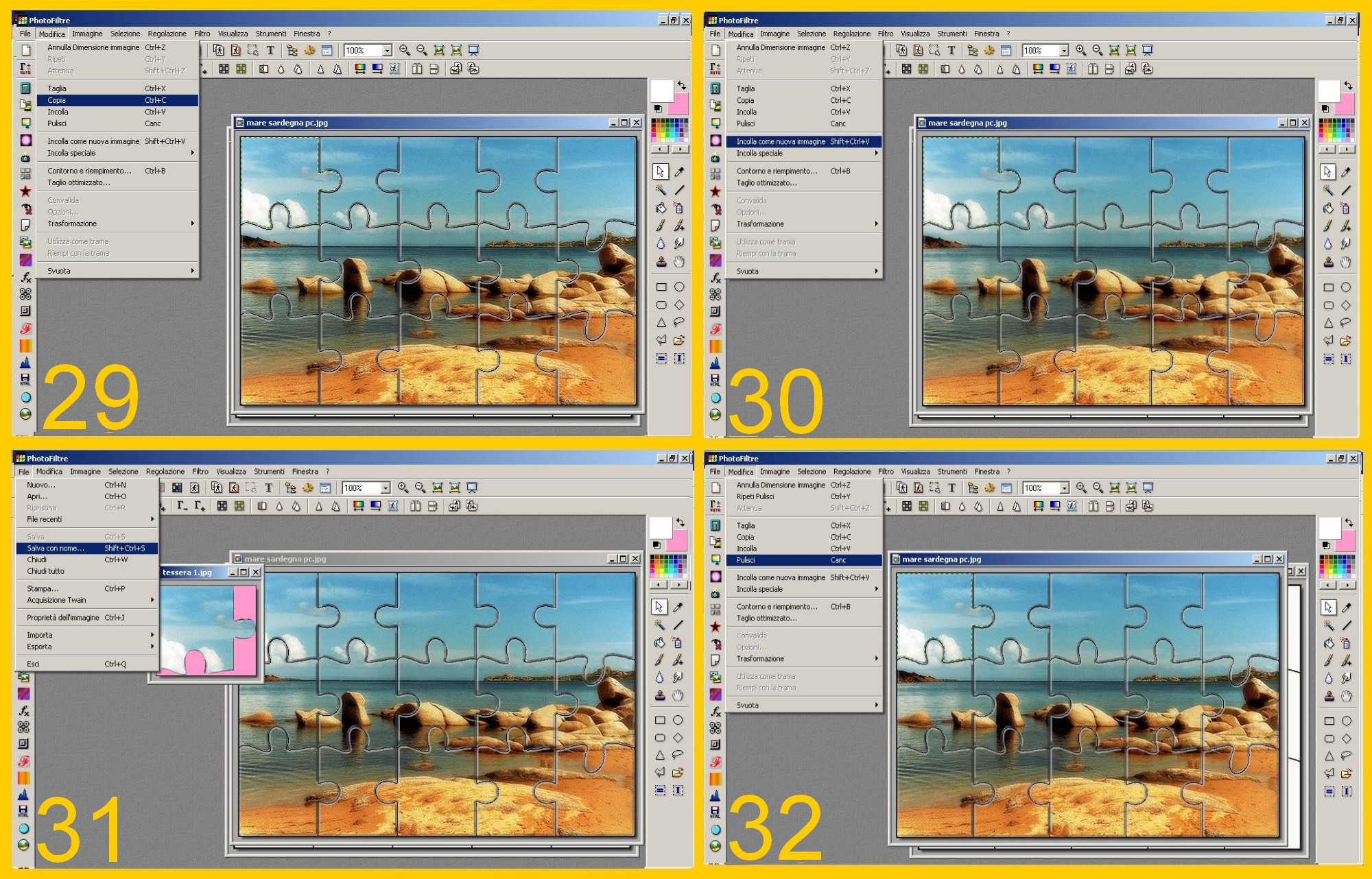 Ora per togliere dal puzzle la prima tessera, toccate il puzzle per attivarlo e dopo aver controllato che la vostra tessera sia selezionata al meglio, cliccate su Modifica – Copia (EDIT – COPY) (imm.29).