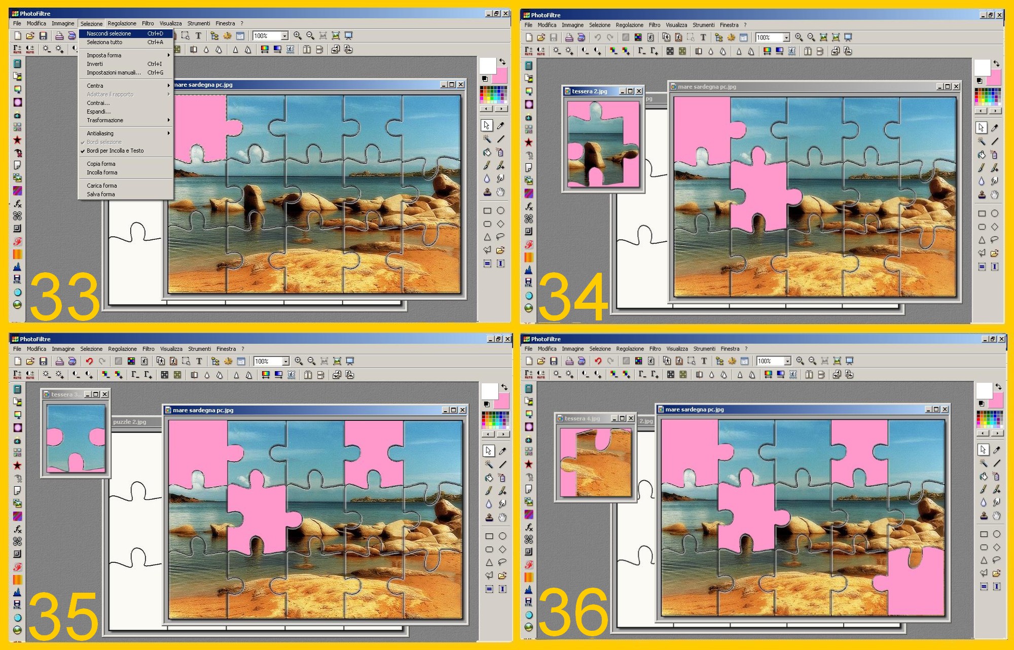 Ora togliete la seconda in alto da destra nello stesso modo e la salvate come tessera 3. Il vostro puzzle ora è come nell’imm. 35.