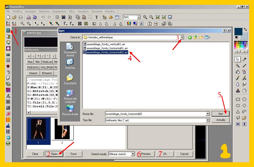 Anche qui, solo nel caso che pensaste di usare immagini con lo sfondo uguale o molto simile: le formule aritmetiche da inserire… Sono quelle di Benjamin Fournier e le trovate qua. Queste formule dovete scaricarle, decomprimerle ed in una cartellina le sistemate in Photofiltre per poi, sfogliando quando usate il plugin aritmetico, aprire quella che vi serva in quel momento (in questo caso Assemblage et fondu horizontal).