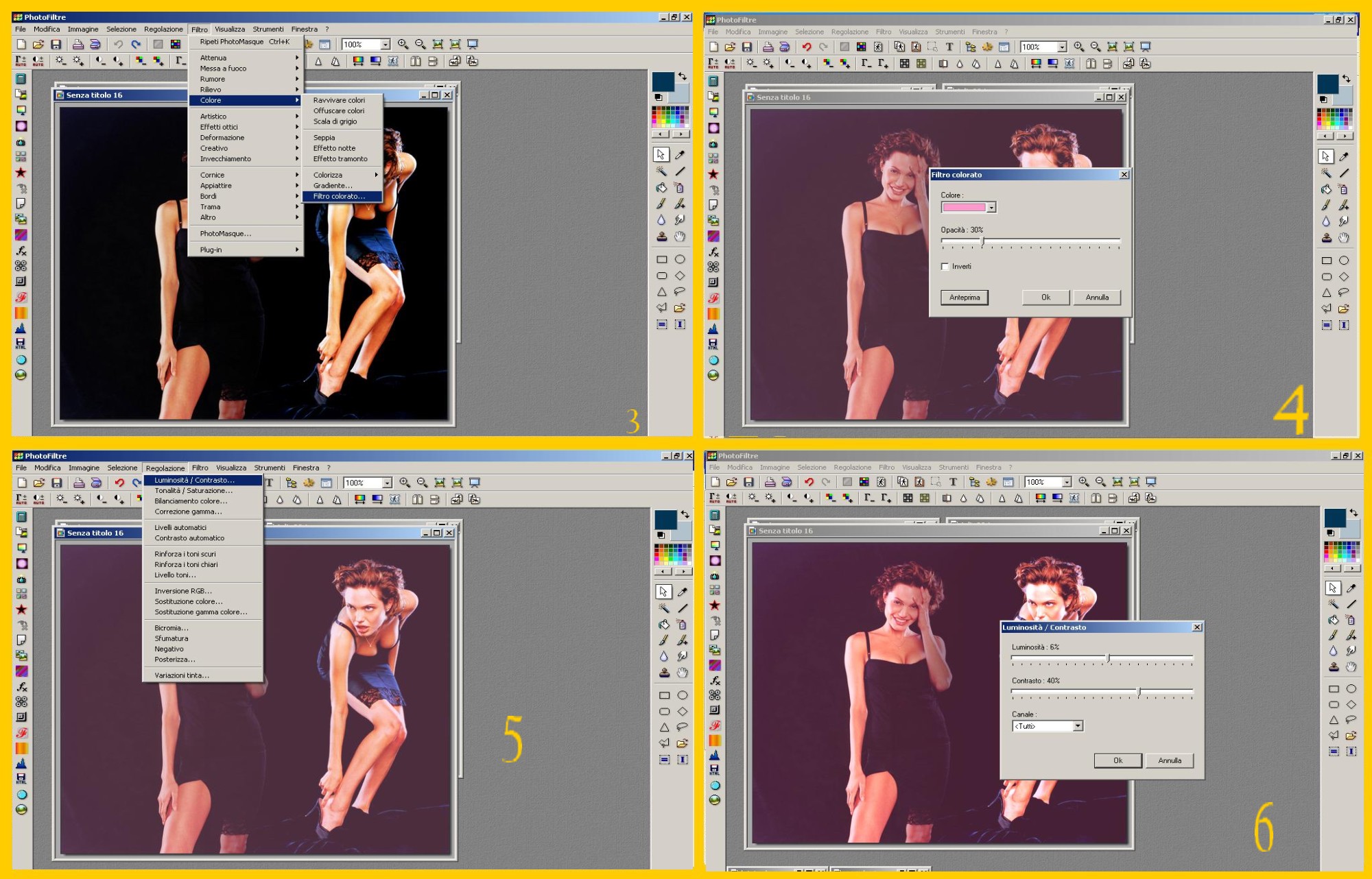 Si può rendere un po’ più evidente e luminosa l’immagine di Angelina cliccando su Regolazione (ADJUST) – Luminosità/Contrasto (BRIGHTNESS/CONTRAST) (imm.5) e nella finestra successiva mettete Luminosità (BRIGHTNESS) 6 e portate il contrasto (CONTRAST) fino a 40 e confermate (imm.6).