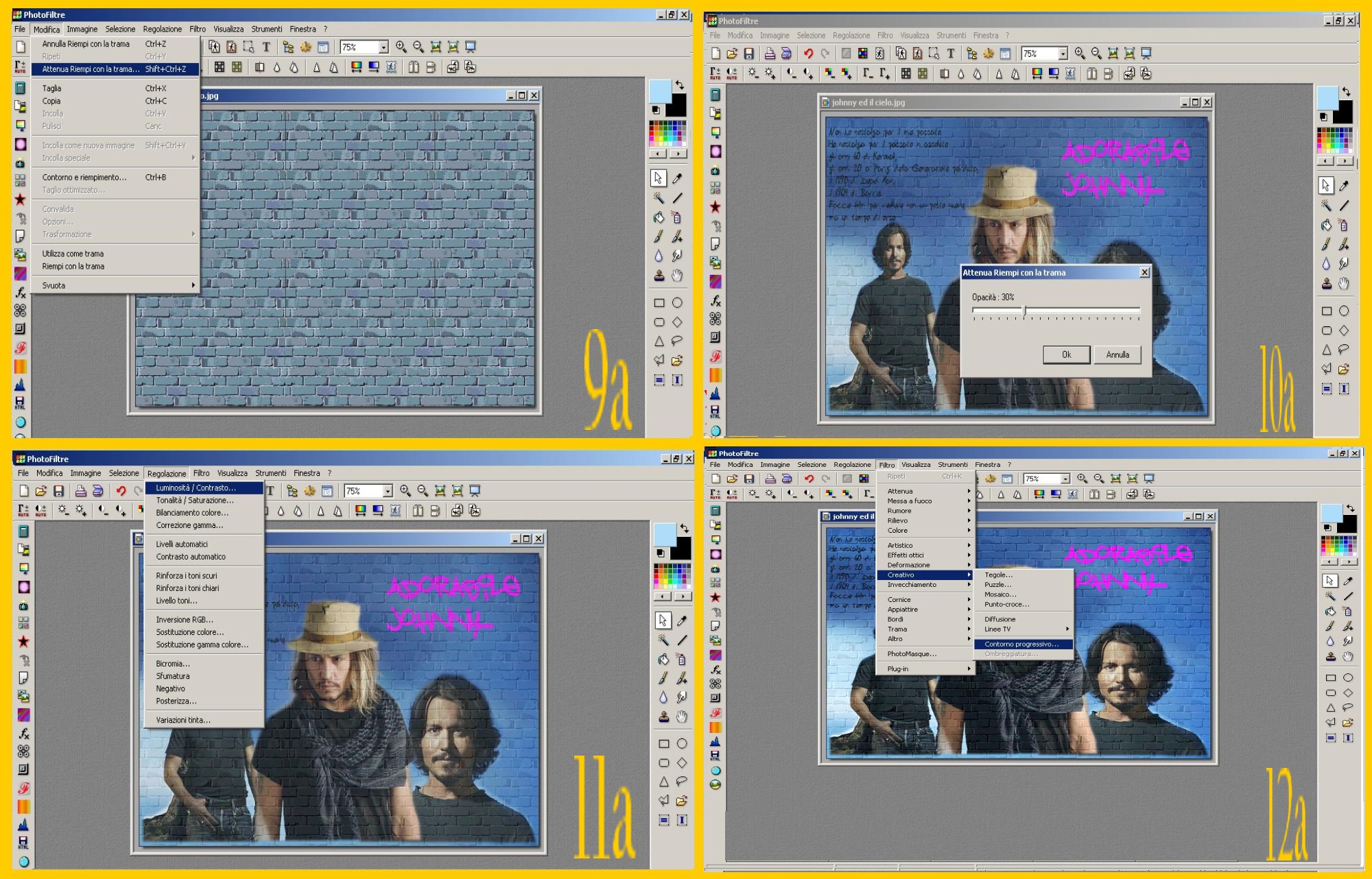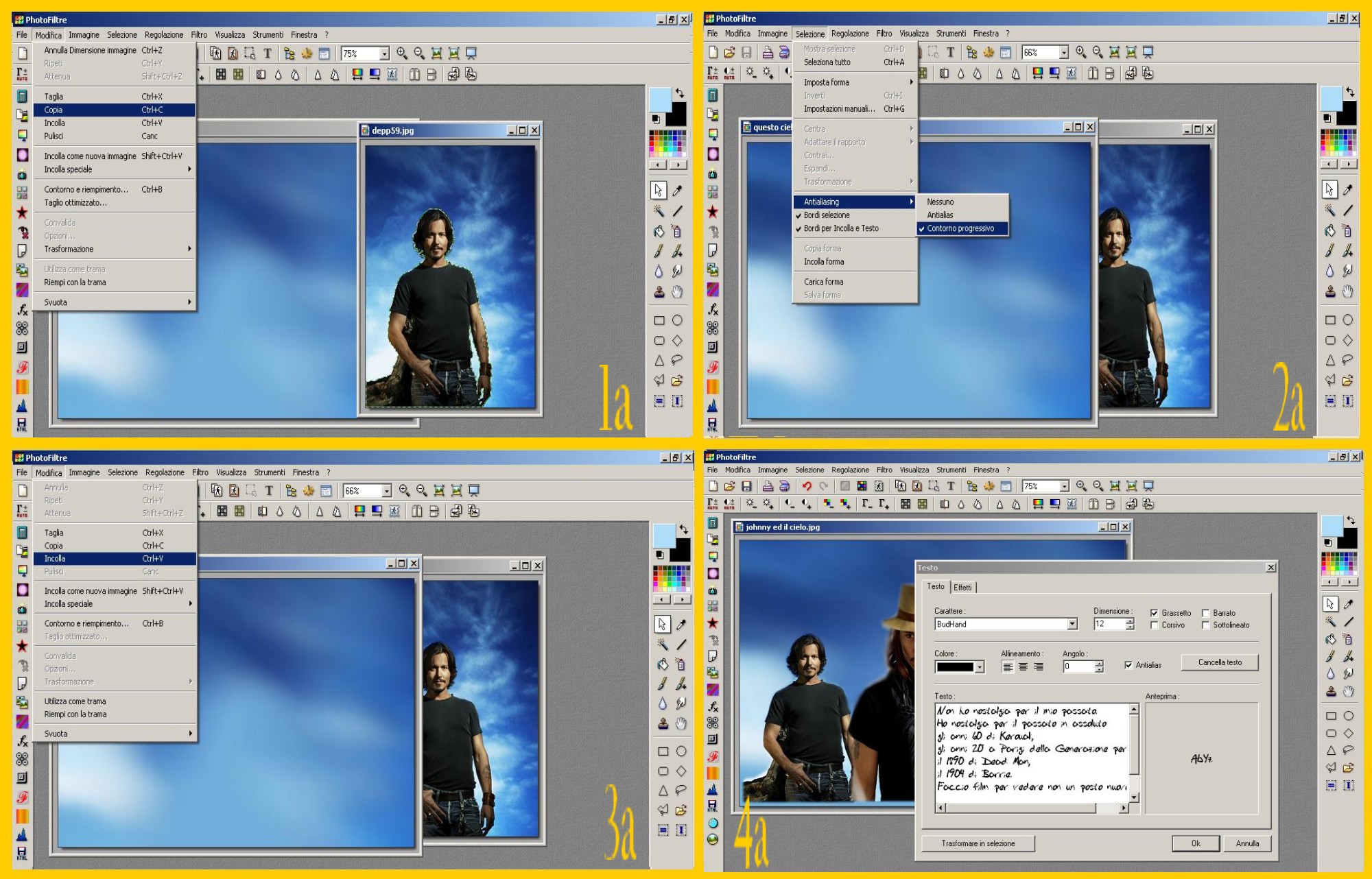Ora ho scritto una frase detta da Johnny Depp (cliccate nella T nel menù in alto) usando come Colore il Nero, carattere “Budhand” e sistemandola poi nella immagine aiutandomi con la selezione nel modo in cui mi sembrava meglio, in alto a sinistra in questo caso (imm.4a)