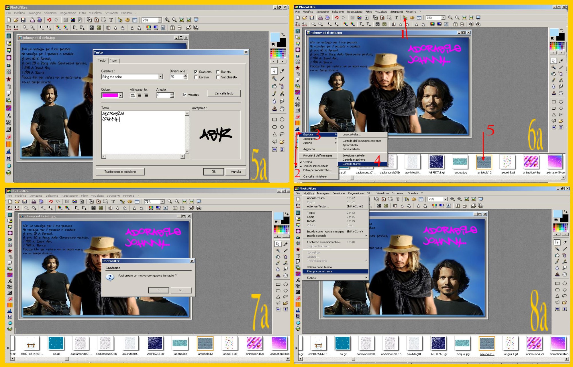 Ora un’altra scritta, questa in Dimensione 40, in un bel Colore Fucsia e con “Bring tha noise” come carattere (imm.5a)… Ho scritto adorabile Johnny, ma ovviamente è solo un esempio. 😀 L’ho messa a destra ed ho confermato.