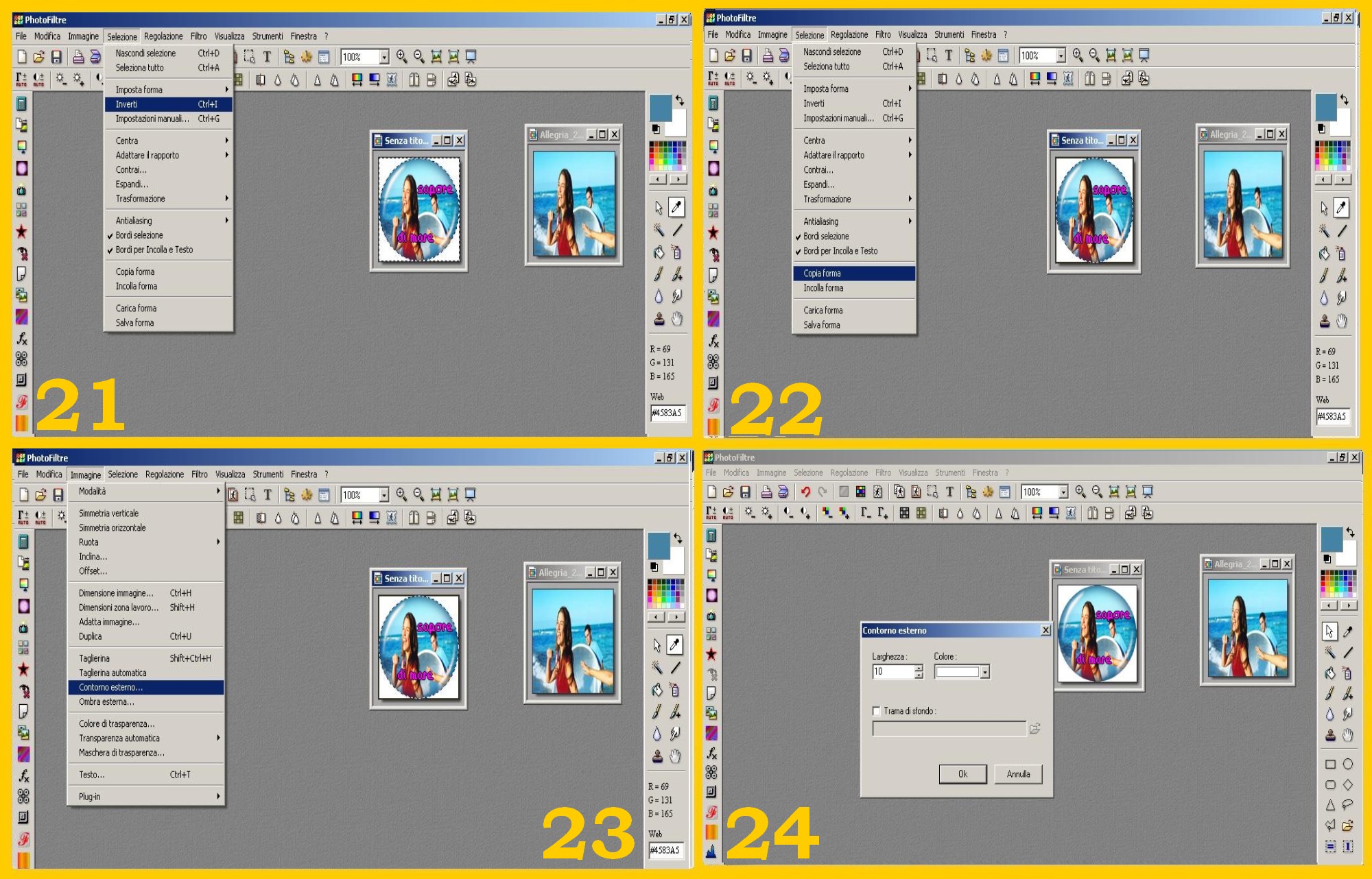 Cliccate su Immagine – Contorno esterno (IMAGE – OUTSIDE FRAME) (imm 23) e nella finestra successiva mettete 10 come larghezza (WIDTH), colore bianco e cliccate su Ok (imm.24).