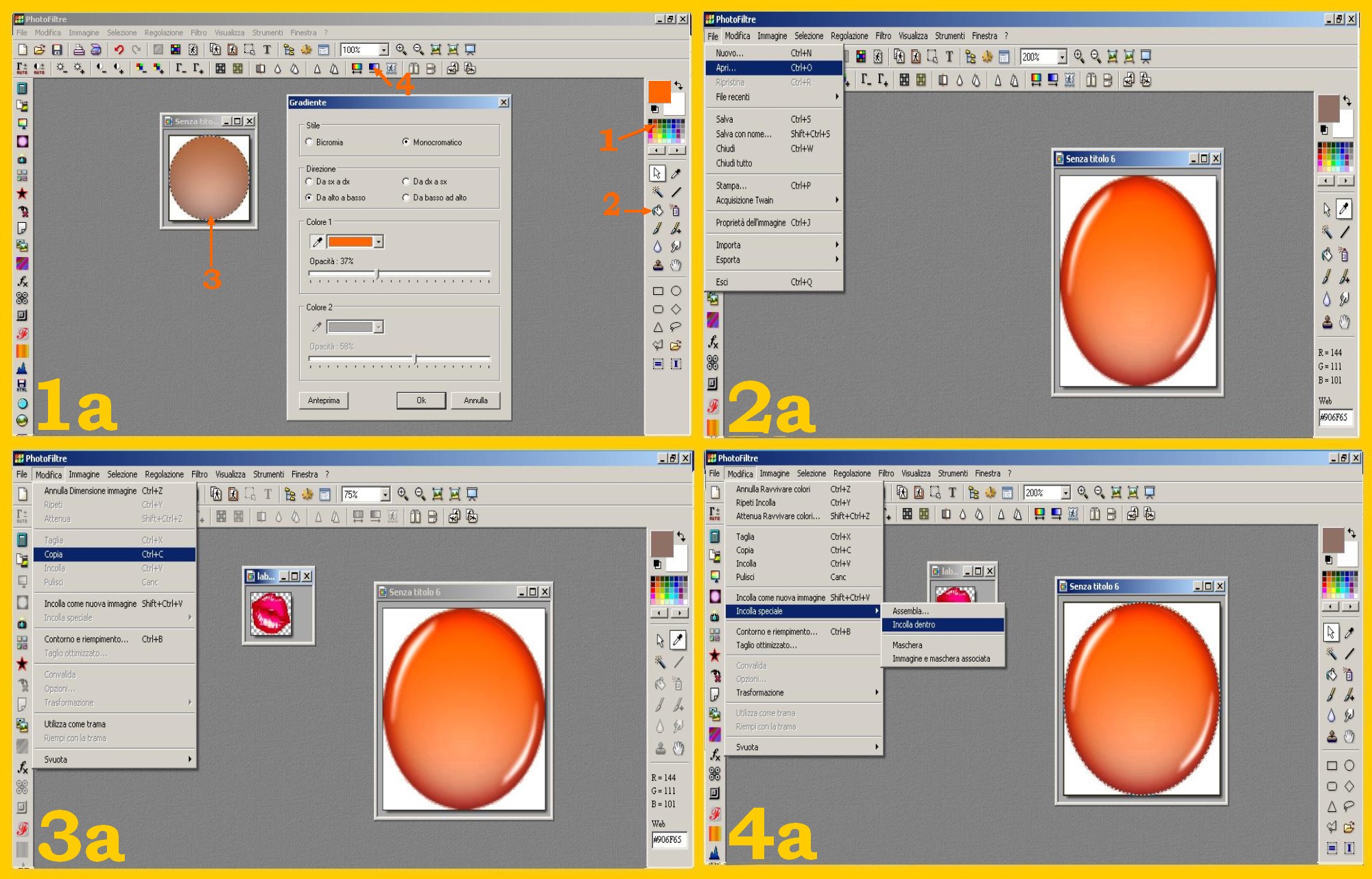 Andate al menù a destra. Scegliete, cliccandoci sopra, il colore con cui volete colorare la spilla (punto 1 imm.1 a) e cliccate sul barattolino di colore (punto 2) andando poi alla vostra immagine e colorando il cerchio cliccandoci sopra col barattolino (punto 3). Io ho scelto poi di fare un gradient arancione per renderlo più brillante cliccando sull’icona del gradient nel menù in alto (punto 4 imm.1 a).
