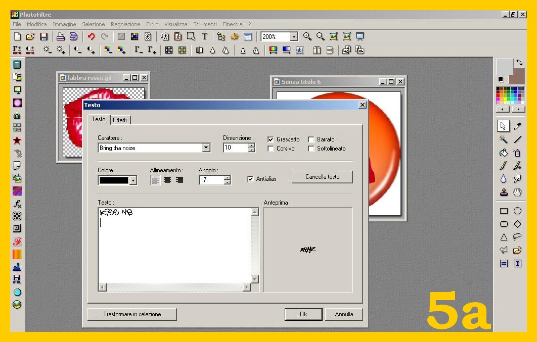 Ora scriviamo sulla spilla. Clicchiamo dunque sulla T del menù in alto. Ho scelto come carattere “Bring tha noie”, colore nero, dimensione 10, selezionato grassetto e dato che la gif l’ho messa storta anche la frase la metterò con un angolo di 17, scrivo il mio testo e confermo con Ok (imm.5 a).