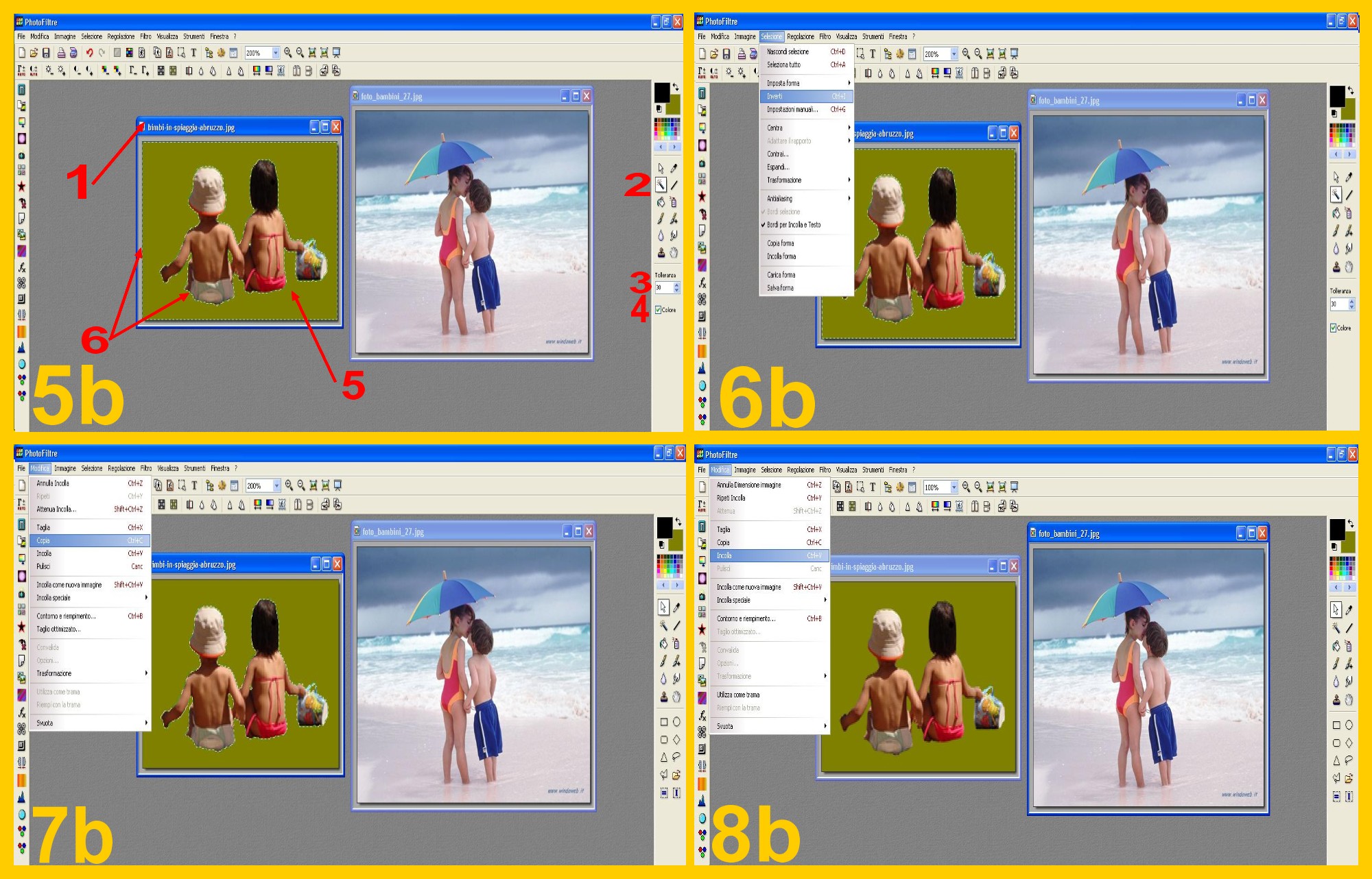 Toccate l’immagine delle bambine per attivarla (punto 1 imm 5b) e cliccate nel Menù di destra sulla Bacchetta Magica (punto 2) e con Tolleranza 30 (punto 3) e la casella colore selezionata (punto 4) cliccate con la Bacchetta sullo sfondo verde (punto 5). Rimarrà selezionato il bordo esterno dell’immagine e le bambine (punto 6 imm 5b).