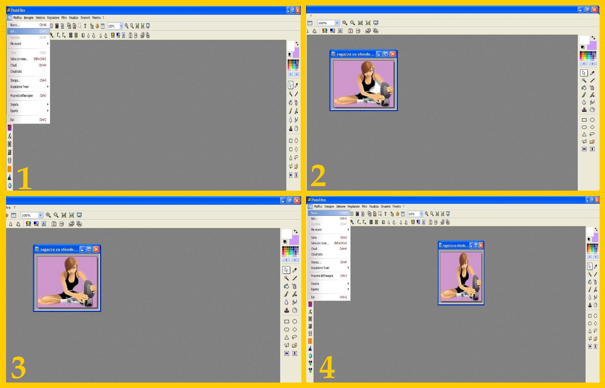 Aprite in Photofiltre l’immagine che vorrete riflettere, in questo esempio la ragazza seduta a terra: File – Apri (FILE – OPEN) (imm.1)