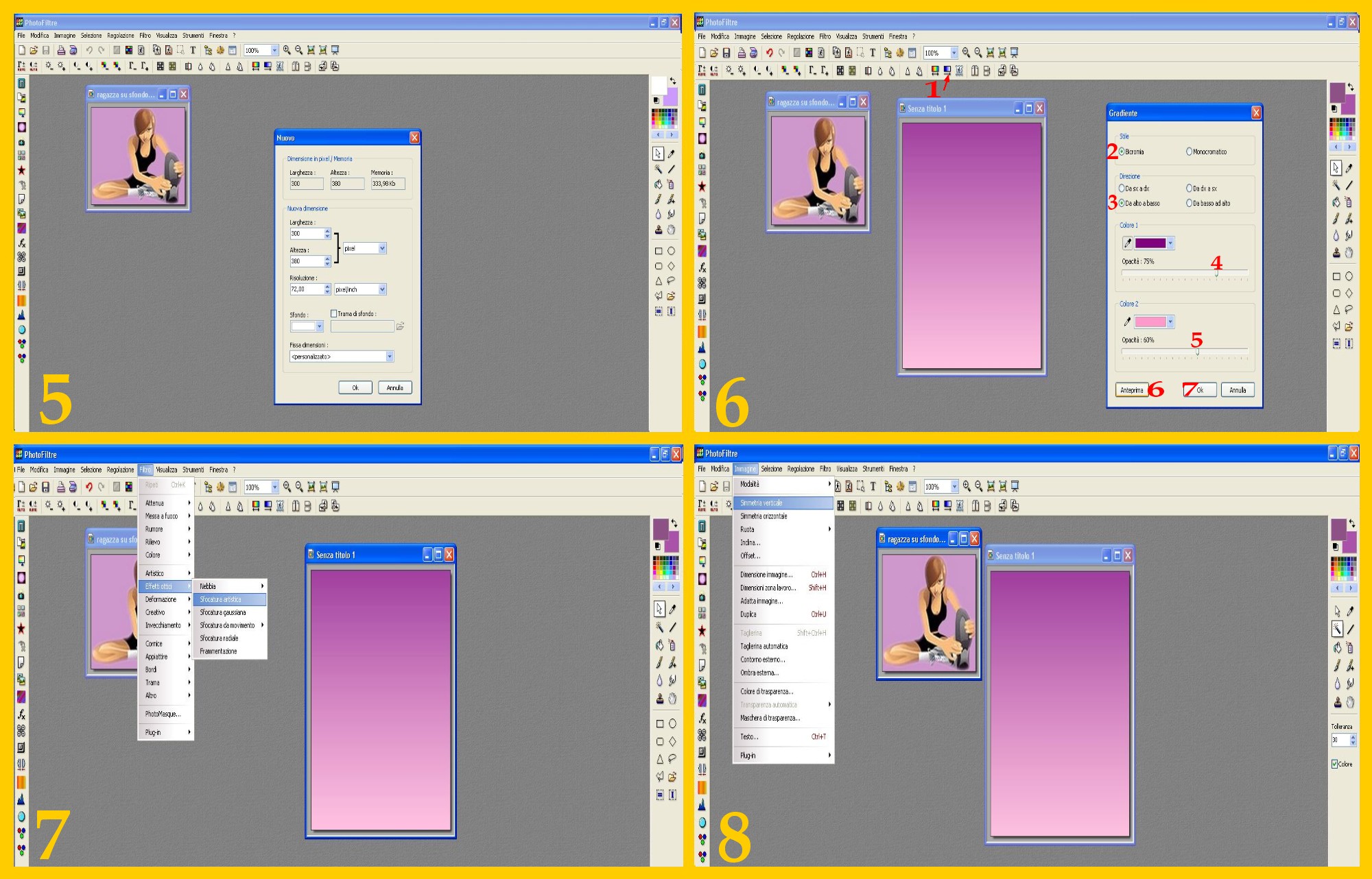 Se vi sembra che appaiano troppo le righe nel colore del gradient potete ammorbidirlo cliccando su Filtro – Effetti Ottici – Sfocatura Artistica (FILTER – VISUAL EFFECT – ARTISTIC BLUR) (imm.7).