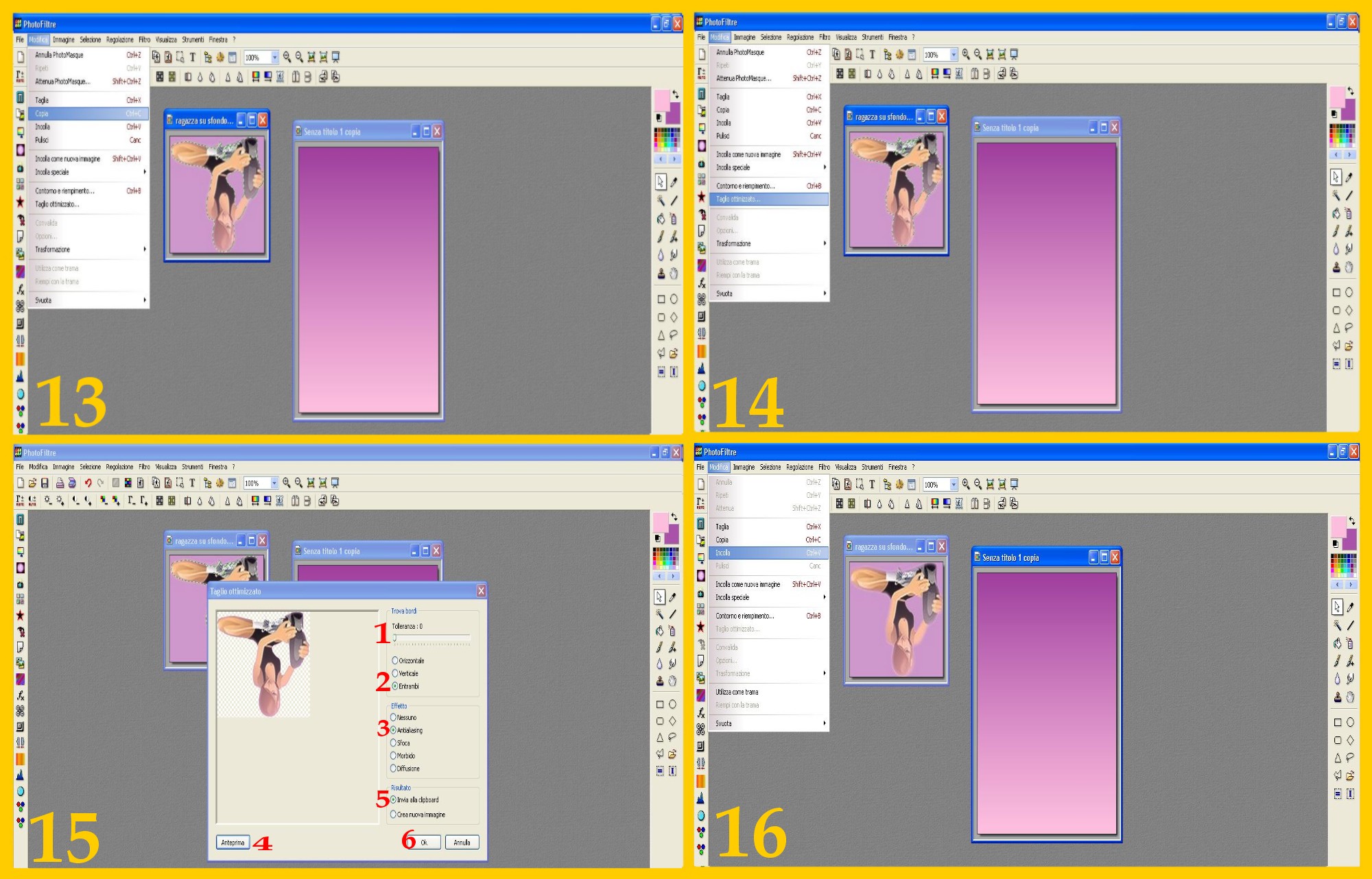 Continuate come nei punti 4 e 5 della prima parte. Io questa volta ho scelto come colore per lo sfondo il viola, voi dovrete comunque scegliere un colore non presente nella vostra immagine per cambiare il colore dello sfondo senza aver poi problemi all’incollatura.