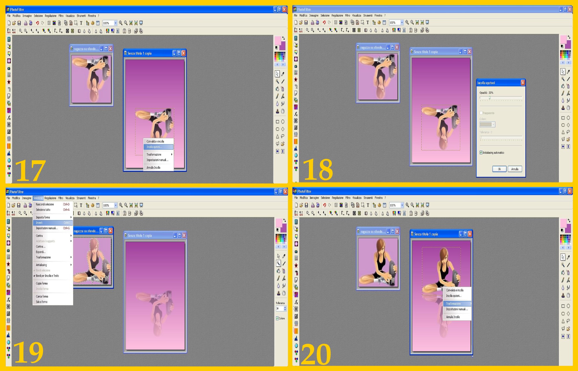 Una volta che la vostra immagine (selezionata) è sullo sfondo, procedete a collocarla al meglio sull’immagine riflessa. Come vedrete, se le due gambe a sinistra si toccano, la suola della scarpa, a destra, tende a sovrapporsi su quella della sua corrispondente riflessa per cui, con il puntatore dentro la selezione, cliccate col tasto destro del mouse e poi su Trasformazione – Distorci (TRANSFORM – DISTORT) (imm.20) e spostate (mettendo il puntatore nel quadrettino in basso a destra) la scarpa in alto quel tanto che vi serve perché non rimangano troppo accavallati il riflesso e la scarpa. Logicamente a seconda di come sia l’immagine che usate, dovrete più o meno adattare il riflesso alla vostra immagine.