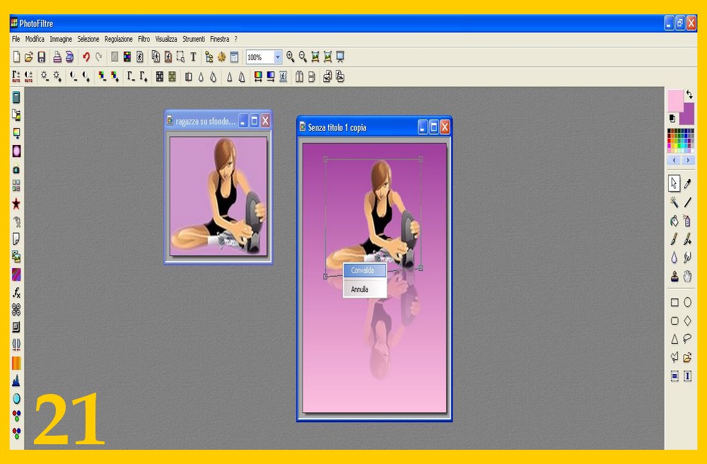 Inizieremo in questo caso dal riflesso in basso. Tocchiamo l’immagine della ragazza per attivarla e clicchiamo poi su Immagine – Simmetria Verticale (IMAGE – FLIP VERTICAL) (imm.8 )