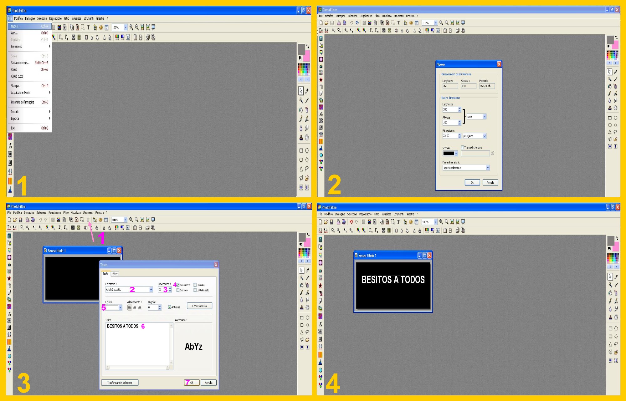 Ovviamente, come vedete anche dagli esempi che precedono queste righe, le scritte possono essere fatte con i caratteri che più vi piacciano e lo stesso vale per gli effetti; io, questa volta, come esempio nel tutorial ne proporrò una molto semplice tanto come carattere che come sfondo, infatti userò come colori soltanto il bianco ed il nero ed il carattere Arial Grassetto ma a volte la semplicità premia e l’effetto è bello quanto una scritta fantasiosa, se non di più. Ecco dunque cosa faremo questa volta…