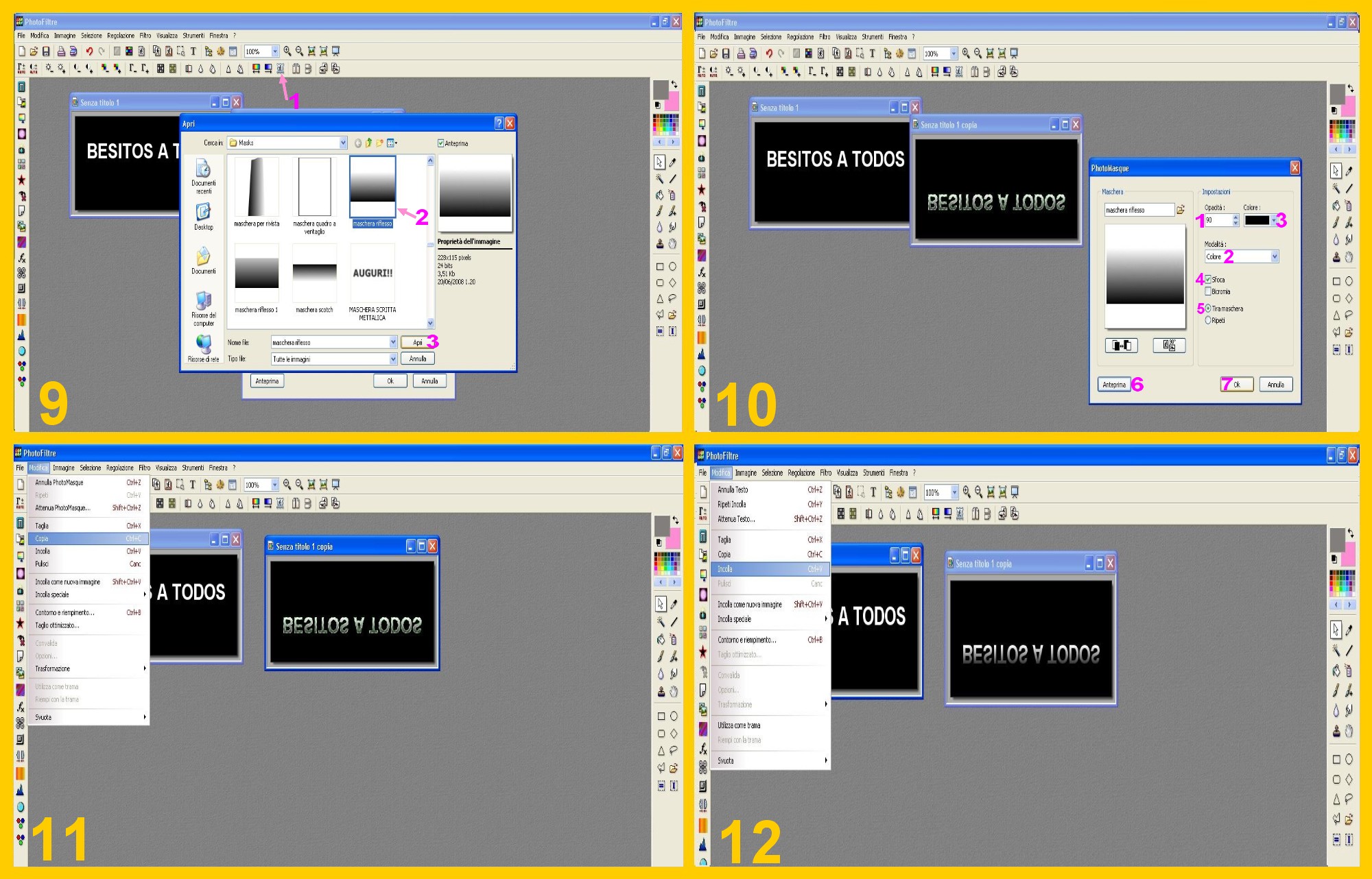 Cliccate ora sull’Icona delle Maschere (punto 1 imm.9) e nella finestra che si apre cliccate sulla Cartellina Gialla e cercate la maschera riflesso che selezionerete una volta trovata (punto 2). Cliccate poi su Apri (punto 3 imm.9).