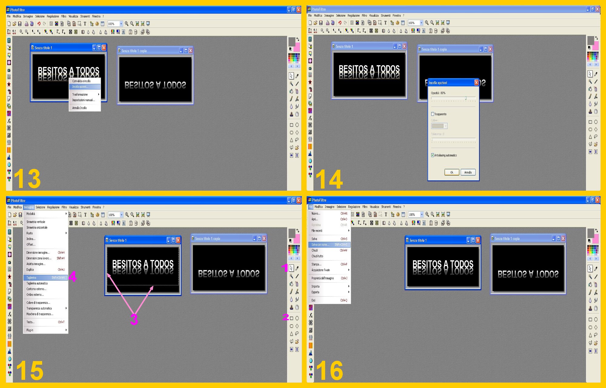 Il vostro riflesso ora è finito… Se, come è capitato a me in questo caso, scritta e riflesso non fossero perfettamente centrati nell’immagine (qua è evidente che è maggiore il pezzo di sfondo che rimane sotto) potete tagliare l’immagine al meglio. Cliccate sulla Punta di Freccia (punto 1 imm.15) e poi sul Rettangolo di Selezione (punto 2) e tornando alla vostra immagine selezionate il contorno in modo che vi appaia centrata (punto 3). Clicate su Immagine – Taglierina (IMAGE- CROP) (punto 4 imm.15) e la vostra immagine verrà tagliata per la selezione che avevate fatto.