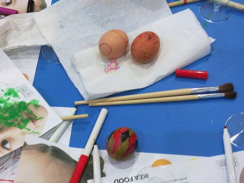 Ecco qui sotto alcune foto, scattate in questo mio viaggio svedese all’Ikea 🙂 , di uova colorate da bambini e mamme e papà…che si divertivano molto…