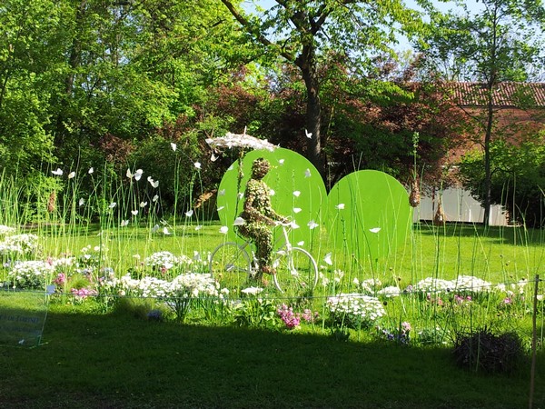 L’accoglienza non poteva essere migliore, “La donzelletta che vien… in bicicletta” creata dal servizio verde gestione città di Torino con materiale di recupero è davvero il miglior saluto per chi arriva.