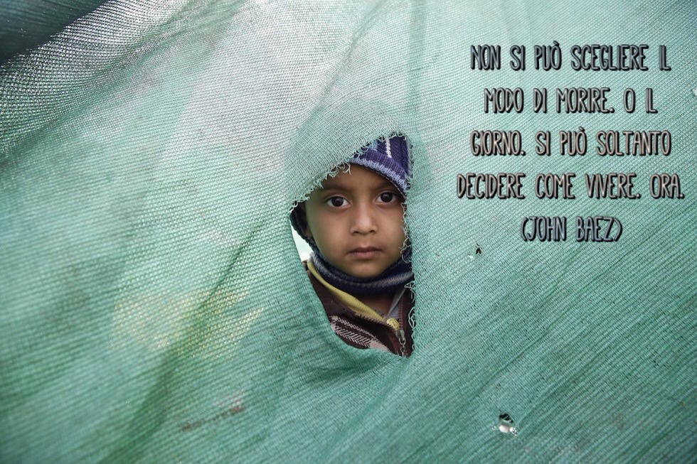 Un bambino guarda attraverso uno squarcio in una tenda montata per ospitare le persone rimaste senza casa dopo il terremoto – Katmandu, Nepal, 27 aprile 2015