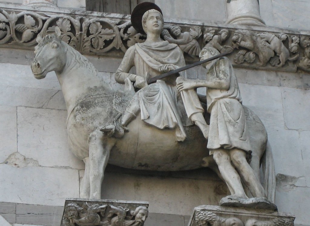 San Martino divide il suo prezioso mantello con un povero, particolare della facciata del Duomo di Lucca dedicato al santo. L’estate di San Martino è contraddistinta dai colori accesi, tendenti al rosso, del paesaggio autunnale, evidenziati dalla luce del Sole.